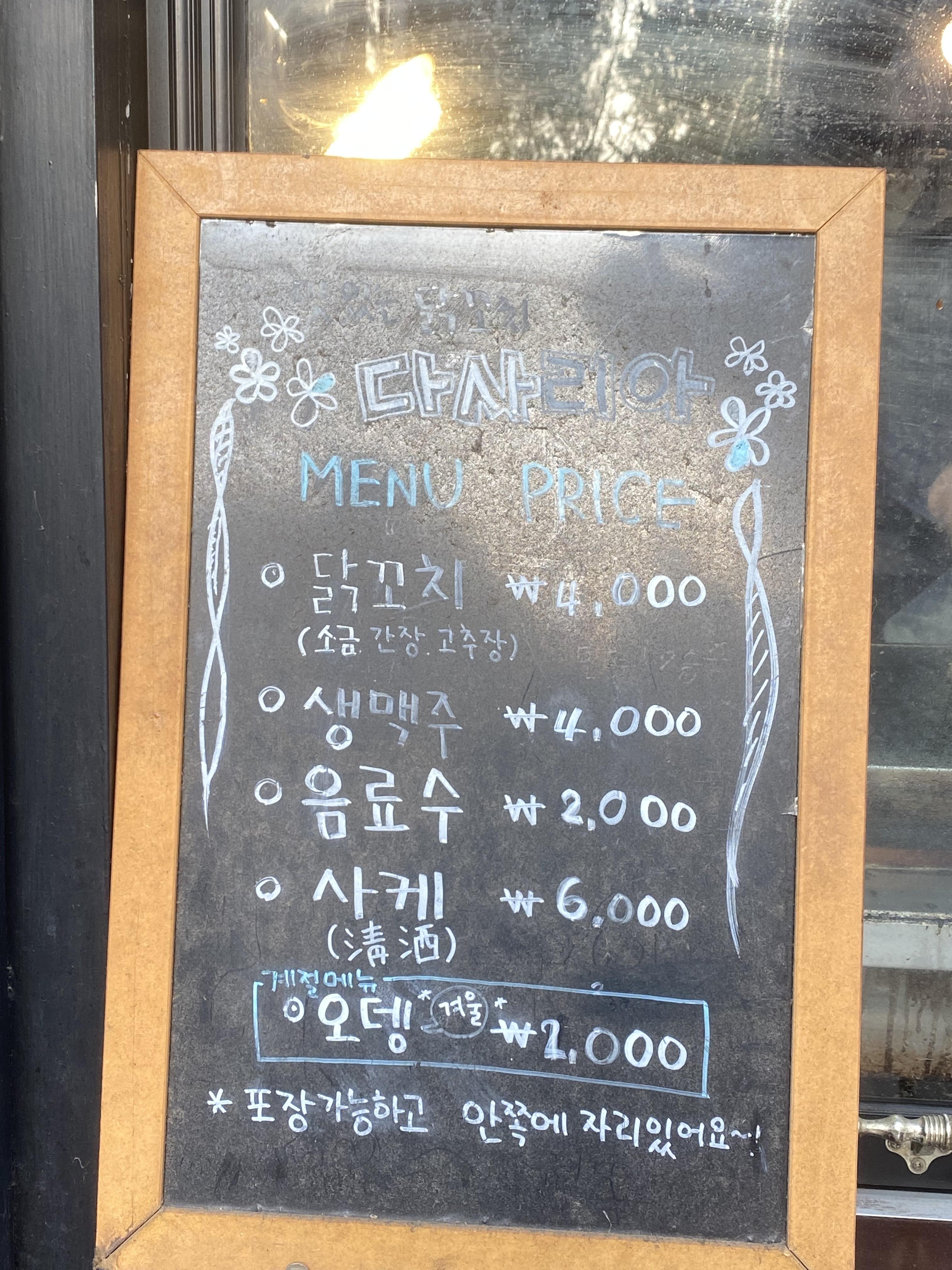 꼬치는 소금, 간장, 고추장맛이 있고, 모두 4천원이에요.