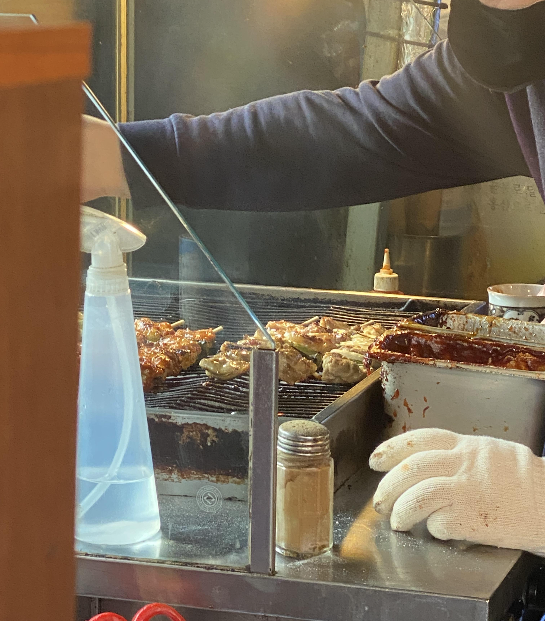 주문이 들어가면 꼬치를 굽고, 양념을 바릅니다.